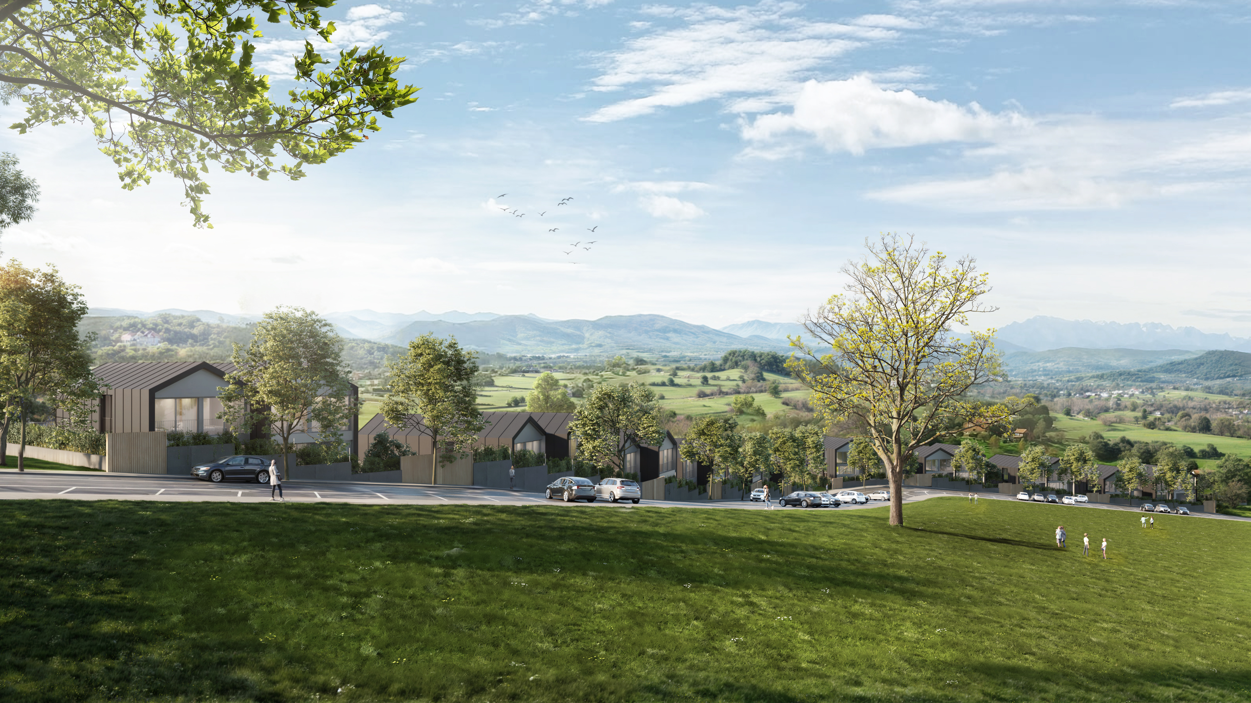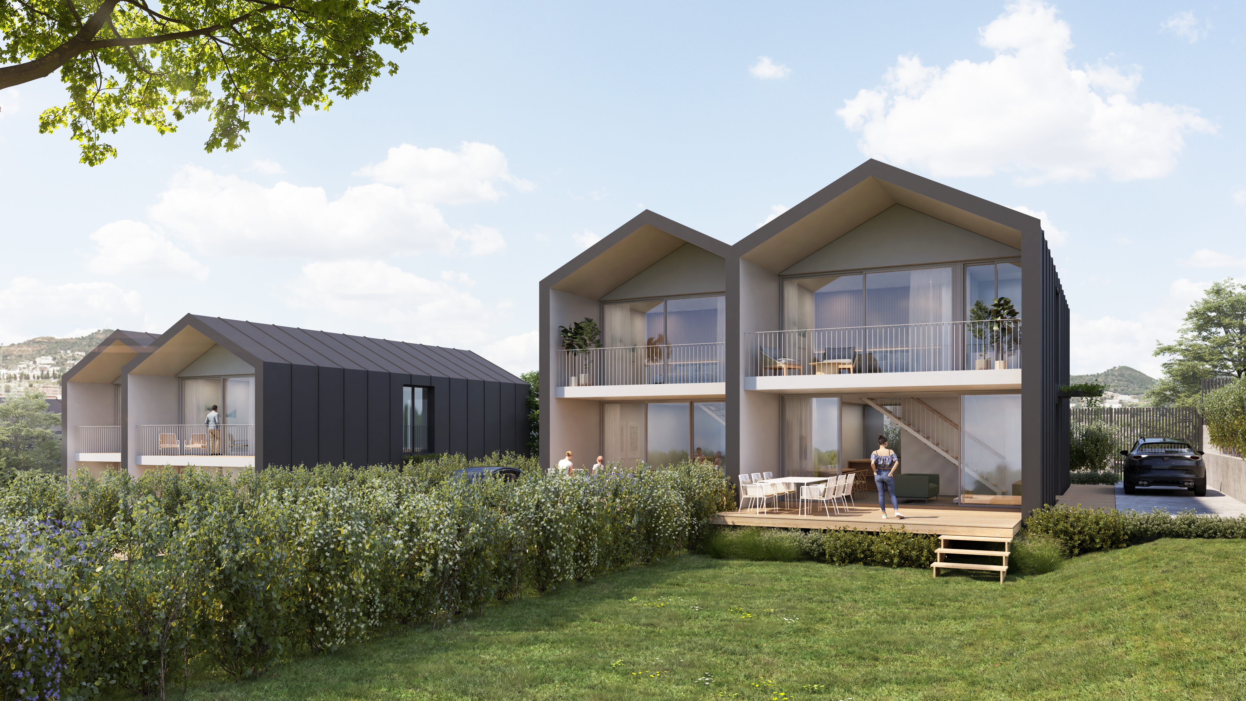 La promoción se organiza en una hilera de viviendas adosadas proyectadas minuciosamente para adaptarse al terreno y ofrecer a sus residentes sosiego y privacidad.